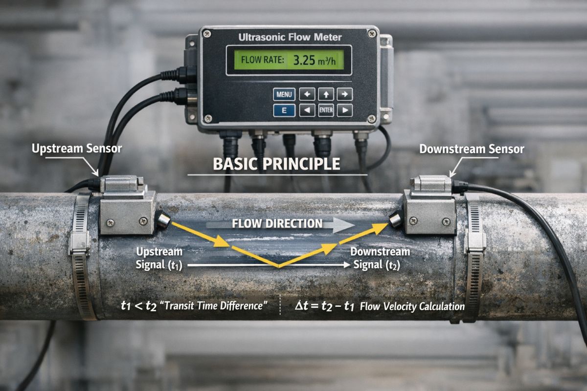 Two transducers are mounted on the pipe: one upstream and one downstream. They send ultrasonic pulses to each other. The meter compares the travel time of ultrasonic pulses moving “with the flow” versus “against the flow,” and the difference relates to flow velocity. Transit‑time is typically preferred for relatively clean liquids because heavy aeration/solids can disturb the acoustic path.